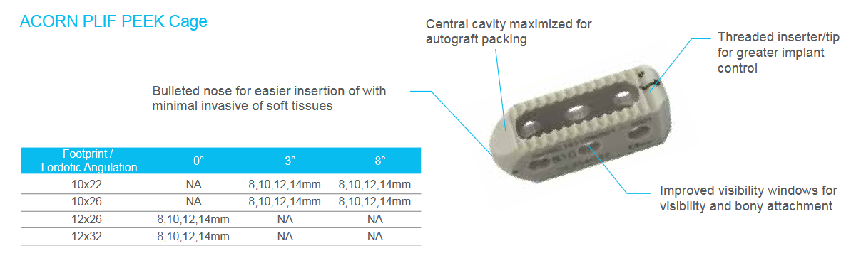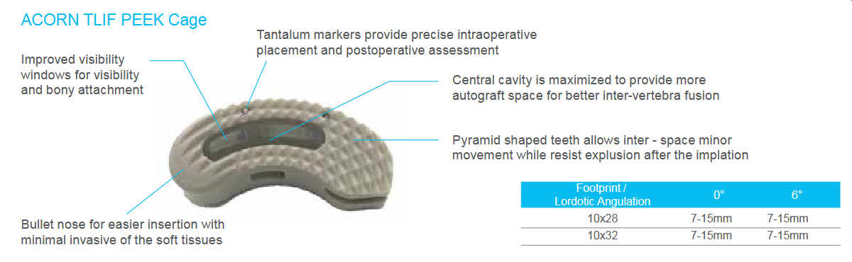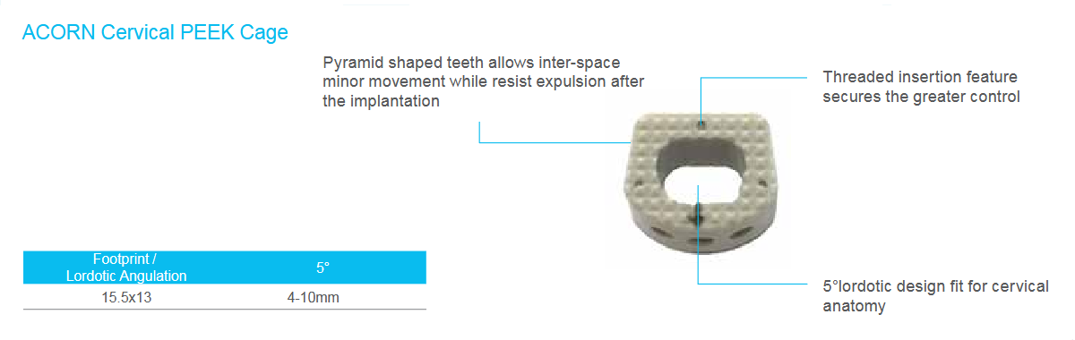 ACORN PEEK Cage Systems restore the disc height and provide the stability during and after the bone fusion period. The three dimensional reconstruction helps to improve the load sharing of the anterior and posterior spinal column and restore anatomic kyphosis/lordosis. The systems also provide varying shape and size configurations to match different anatomies.