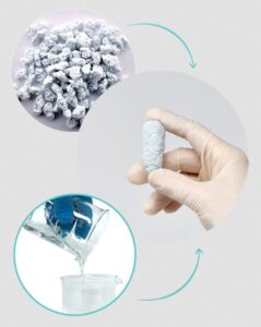 si-Mochi contains multi porous structured bi-phase Calcium Phosphate ceramic granules. These are suspended in an aqueous polymer carrier gel, creating a pre-mixed putty.